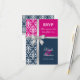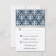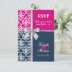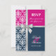 © Socialite Designs. Cartão de resposta de convite de casamento elegante para um casamento de verão incorporando damasco branco, uma fita prateada com laço e cruz impressa, e duas cores de fundo, azul-marinho e fúcsia. Entre em contato com a Socialite Designs se desejar uma combinação de cores diferente, ajuda com personalização ou outros produtos de casamento criados com este design. POR FAVOR, OBSERVE QUE A FITA É UMA IMAGEM E É IMPRESSA NO CONVITE.