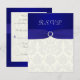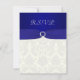 **** POR FAVOR, NOTE que a fita e as joias são imagens impressas e não são reais. Este elegante cartão de resposta em damasco azul e marfim combina com o convite de casamento mostrado abaixo. Se precisar de ajuda para personalizar este cartão de RSVP ou se desejar itens adicionais que combinem, envie um e-mail para niteowlstudio@gmail.com com o seu pedido.