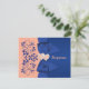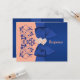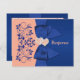 Este elegante e romântico cartão de confirmação de presença para casamento com flores em tons de pêssego e azul real tem uma fita e laço IMPRESSOS com um par de joias de diamante IMPRESSAS e corações unidos com brilho FALSO que combina com o convite de casamento mostrado abaixo. ****POR FAVOR, OBSERVE que não há relevo ou imagens em relevo neste cartão. ALÉM DISSO, a Zazzle NÃO editará nada em relação a erros de digitação, alinhamento ou espaçamento, então, por favor, certifique-se de que o seu texto esteja exatamente como você deseja. Não verei seu convite, então, se precisar de ajuda com a personalização do meu design, por favor, envie-me um e-mail ANTES de fazer o pedido. Tudo é impresso plano. As escolhas de texto e papel são totalmente personalizáveis, mas NÃO sugiro mudar o papel para Kraft ou metálico prateado, pois são muito escuros e alterarão a legibilidade e