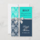 © 2013 Socialite Designs. Cartão de confirmação de presença para convite de casamento elegante para um casamento de verão ou inverno incorporando damasco branco, uma fita prateada com laço impressa e duas cores de fundo, azul-marinho e turquesa / aqua. Entre em contato com a Socialite Designs se desejar uma combinação de cores diferente, ajuda com personalização ou outros produtos de casamento criados com este design. POR FAVOR, OBSERVE QUE A FITA É UMA IMAGEM E É IMPRESSA NO CONVITE.