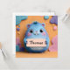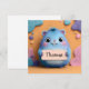 Esta ilustração 3D adorável apresenta um hamster azul liso ou criatura peluda com características kawaii. O personagem tem olhos grandes, bochechas cor-de-rosa e guarda um sinal cor de pêssego de vazio para mensagens personalizadas. O fundo apresenta formas vibrantes de laranja e pasta macia.