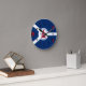 Relógio com bandeira da cidade de Fort Wayne, Indiana; bandeira azul e branca e com um bloco vermelho no centro e três ilustrações no campo azul - ilustração da cabeça do Nativo Americano, da fleur-de-lys Francesa e do leão Britânico