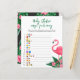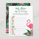 O design de convite para chá de fraldas apresenta flamingo cor-de-rosa com frondes verdes de palma e flores de hibisco tropicais. "Aloha Baby". Um padrão floral tropical com cor preta de fundo se veste na parte de trás do cartão.