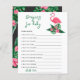 O design de convite para chá de fraldas apresenta flamingo cor-de-rosa com frondes verdes de palma e flores de hibisco tropicais. "Aloha Baby". Um padrão floral tropical com cor preta de fundo se veste na parte de trás do cartão.