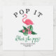 "Pop. Quando ela pop!" O design de convite para chá de fraldas apresenta flamingo cor-de-rosa com frondes verdes de palma e flores de hibisco tropicais. "Aloha Baby". Um padrão floral tropical com cor preta de fundo se veste na parte de trás do cartão.