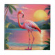 Pássaro flamingo rosa numa praia tropical com o mar e um pôr do sol ao fundo