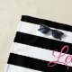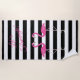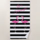 Esta toalha de praia branca e negra listrada tropical é acentuada com dois flamingos cor-de-rosa fofinhos, e Flamingle de Vamos, escrito em rosa claro, fazer perfeito para sua próxima festa de piscina ou dia na praia!