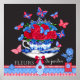 Um poster com um antigo copo de porcelana cheio de flores azuis e vermelhas e borboletas contra fundo de quadro negro. Parece excelente como um par com o Fleur Porcelain Birds e o cartão Birdcage. Bonito Flair Francesa!