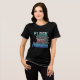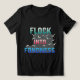 A design de t-shirt apresenta o texto "Flock into Fondness" numa letra de cor arrojada e multicolor, com um bando de aves a voar em torno do texto. As cores são vibrantes e atraentes para os olhos, e a design geral é caprichosa e divertida.