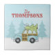 Carro azul russo Vintage ou vagão de madeira com uma árvore de Natal Freshly Cortada amarrada ao topo do carro dirigindo na neve do floco de neve. Uma cena química e moderna do país. Personalizado com seu nome, uma maneira maravilhosa de desejar um Feliz Natal e Felizes Feriados.
