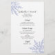 Personalize o festivo Blue Snowflakes no Menu White Casamento no inverno com os detalhes da refeição que servirá no almoço de chá de panela de dezembro, Janeiro ou fevereiro, ensaie a janta ou a recepção de casamentos adicionando a salada ou o primeiro curso, a entrada ou o segundo curso e a sobremesa ou o terceiro curso. Personalize-o com os nomes da noiva e do noivo, localização do local e data do evento. Este elegante e personalizado cardápio de casamento da Maravilha de inverno apresenta intrincados flocos de neve azuis adorando os cantos com um fundo branco.