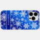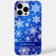Crie uma capa de telefone de Natal personalizada com um padrão real de flocos de neve azul e branco. O modelo torna fácil digitar seu nome.