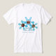 T-Shirt "Flocos de neve e branco" é uma forma de se vestir num design sazonal com uma ilustração estilizada que você pode personalizar, já que existem três fotos/gráficos intercambiáveis e duas frases: "Flocos de neve são borboletas de inverno" e "Feliz Natal e Feliz ano novo". Você pode digitar seus próprios ícones, imagens ou mensagens. Ou apagar também. A cor dominante é azul e branca.