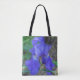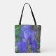 Uma fotografia de perto de uma bela flor azul da íris impressa em ambos os lados de um saco de tote.