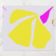 Este rótulo contém uma flor grande e plana amarela de limão e caule de fuccia sobre fundo lilático.