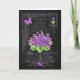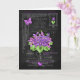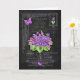 Este cartão com um visual luxuoso tem ilustrações de flores desenhadas à mão de buquês de flores de nascimento e pedras de nascimento brilhantes para aniversários de fevereiro, aniversários e dias especiais. Quadro de giz preto com gravações antigas de ferragens decorativas fornecem um fundo nostálgico para os buquês de flores, gemas e borboletas enfeitadas com jóias.