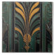 Painel do estilo Art Deco com um design floral simétrico, com uma flor estilizada central em ouro e verde, flanqueado por padrões geométricos e bares verticais, todos colocados sobre um fundo verde escuro com um acabamento envelhecido e texturizado.