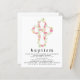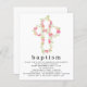 Um valor para o alternativo do ORÇAMENTO em tamanho menor de 4,5 x 5,6" de semirbrilho de 110 lbs, que é de espessura semelhante a um cartão postal (no entanto, não é adequado para uso como cartão postal). POR FAVOR, OBSERVE QUE HÁ UM convite por folha. Florais Rosa Cruzam Convite Batismo. Uma grande cruz com flores cor-de-rosa está na metade superior. O cabeçalho é grande em na moda lowercase com os detalhes abaixo. Personalize facilmente o texto para seus próprios detalhes.