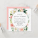 Convite floral Elegante de primavera com seus nomes e detalhes de casamento enquadrado por um círculo de flores brancas e escamosas de aquarela e folhas verdes escorridas. O convite de casamento quadrado é perfeito para primavera e casamentos de verão.