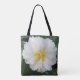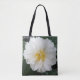 Um bolsa floral adorável com uma flor de camélia mostrada aqui. Uma bela flor branca sobre fundo verde de folhas escuras na floração do cheio. Estame amarelo e pólen no centro da flor. Esta é a flor do estado do Alabama. Tome orgulho e vista a camélia no estilo.