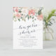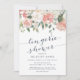 O chá de panela elegante e moderno de lingerie floral apresenta um buquê de rosas de aquarela pastel macia, peonias e híbridos em tons de rosa-pincel, pêssego e creme, com folhas botânicas verdes e eucalipto. Personalize com os detalhes do seu chá de lingerie em letras azuis elegantes, acentuadas com caligrafia de estilo manuscrito.