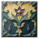 Art Nouveau azulejo cerâmico envidraçado com uma pequena flor roxa profunda no centro, folhas amarelas e detalhes amarelos, fundo envolto em verde escuro, brincos de bud roxo e espirais florais.