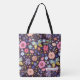 Tote bag in dark plum with with white name label. Flower arrangements in medium pink, periwinkle, pink, orange, and yellow. Personalize this tote bag with your business name and your name.