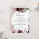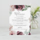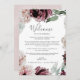 Estas cartas de boas-vindas do romance floral e os cartões itinerários são perfeitos para um casamento elegante. A moderna design do bico rústico apresenta flores românticas a aquarela em tons macios de burgundy, mauve, rosa-pincel e branco-creme com folhas verdes. A frente da carta apresenta uma carta de boas-vindas e a parte de trás da carta apresenta o itinerário do casamento. Estas notas são perfeitas para casamentos de destino e bolsas de boas-vindas de hóspedes.