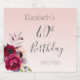 Uma etiqueta para uma festa de aniversário de 40 anos. Um fundo mbre de rosa de ouro fino e elegante. Decorado com flores roxas escuras, arrojadas e rosa cor-de-rosa. Modelos para um nome e uma data. O texto: aniversário de 40 anos é escrito em cinzas escuras com um grande script de estilo escrito à mão moderno.