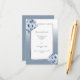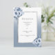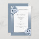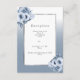 Uma carta de detalhes elegante. Uma falso estrutura prateada e branca com rosas de cor aquosa em tons de azul. Um gradiente azul empoeirado, fundo ombre. Modelos para os detalhes da sua recepção de casamento, texto de cinza escura. Fundo: fundo azul empoeirado. Perfeito para um casamento de inverno ou primavera.