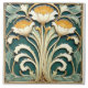 Art Nouveau azulejo com três flores brancas com pistilhas amarelas, folhas verdes e caules ouros sobre fundo verde-escuro.