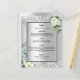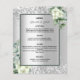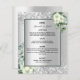 Personalize e adicione seus nomes, data e menu de casamento. Um fundo com aspecto fino prateado, decorado com flores brancas e verde, confetti.