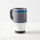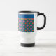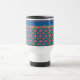 Uma Caneca de viagem chic não-derramar, com um padrão floral de Flores Cor-de-Rosa e Laranja, agrupada com um padrão de Bolinhas correspondente em um Fundo Azul Profundo. Parte da coleção Posh & Painterly 'Rangoli', este padrão pode ser ajustado para ajustado qualquer Mug.