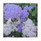 Azulejo cerâmico que apresenta uma foto de flores azuis e brancas de Ageratum, comumente conhecidas como Flor e Bluemink. Um design floral adorável! Selecione o tamanho do seu azulejo. Faz uma bonito trivet de cozinha!