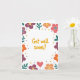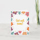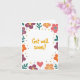 Este heartíssimo cartão de saudação 'ficar bem' apresenta um fundo branco adornado com um conjunto delicioso de flores coloridas de desenho animado, folhas, e um 🌸 cardíaco 💛 As flores vêm em uma gama de matizes vibrantes, incluindo roxo, rosa, azul, laranja e pêssego, cada uma com polos amarelos ensolarados e pétalas moles e redondas. Algumas das flores espiam pelas bordas da placa, adicionando um toque divertido e dinâmico à design. Um pequeno coração cor-de-rosa se senta suavemente abaixo do texto lúdico "Fique bem rápido!" em uma fonte amarela alegre com um contorno negro e ousado. As folhas verdes estão dispersas entre os florescentes brancos, criando uma vibração viva e elevadora. Pequenos pontos amarelos e faíscas de cinza adicionam charme e brilho extra a esta encantadora mensagem de sucesso! 🌼 💖