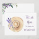 Obrigado por ser meu cartão de Dama de Honra. Este design apresenta uma ilustração em aquarela de flores de lavanda sobre um chapéu de palha. No verso - folhagem de eucalipto e flores de lavanda roxa.