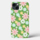 Padrão divertido e alegre de flores margaridas ao estilo retrô em tons pastéis de turquesa, rosa, amarela e branca dançando sobre um fundo verde vibrante com polkadots verdes e macios. Este padrão foi inspirado pela minha linha tropical de designs flamingos.