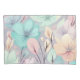 Esta design apresenta um fundo roxo leve com flores e folhas pastéis. As flores são cor rosa, azul e verde, enquanto as folhas são cor rosa, verde e laranja.