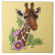 Retrato de uma girafa fofa contra um pano de fundo amarelo com flores cor-de-rosa.