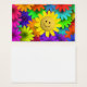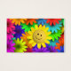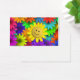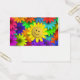 Flor da face amarela adorável e fofinha que repousa sobre um leito de flores néon brilhantes e coloridas. Colorida e alegre.