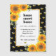 Um fundo preto chico decorado com girassóis de cor aquática rústica e abelhas tromboçadoras felizes sorrindo. Com o texto: Home Sweet Home. Personalize e adicione seu novo endereço e nome.
