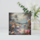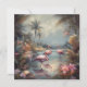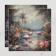 pintura botânica com flamingos na água cercada por palmeiras e flores tropicais