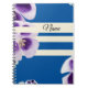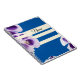 Belo design com flores roxas e fundo azul com linhas brancas além de espaço para o seu nome e texto personalizado.