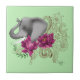 Perfil lateral de um elefante com tronco para cima. Flores fuchsia lotus e hena num pano de fundo verde