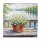 azulejo bonito com uma bela ilustração das flores brancas em um pote de cobre com vista de trás de um lago sereno com pinheiros.
