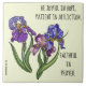 Bonito azulejo decorativo floral (íris roxa sobre fundo amarelo pálido) com verso das escrituras dos romanos 12:12 "Seja alegre em esperança, paciente em aflição, fiel em oração."