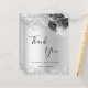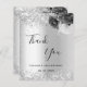 Um cartões de agradecimentos para um aniversário de 50 anos (ou qualquer idade). Um fundo de olhar mal prateado. Decorado com flores, flores e brilho sujo, faíscas. À frente, um grande texto escrito à mão e o texto: Obrigado, seu texto, título e uma data. Voltar: personalize e adicione seu nome e nota de agradecimento.