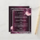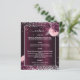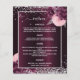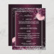 Um elegante e glamouroso menu de casamento. Um fundo de gradiente arrojado profundo, decorado com falso brilho prateado, faíscas e flores rosa e burguesas. Texto branco. Personalize e adicione o menu. Você pode adicionar mais texto, fotos no verso. 1 folha = 1 menu impresso borda a borda.