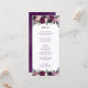 Flores de aquarela em tons de lilás rico, gentil, berinjela profundo e corante de orquídeas roxo e rosado com botânicos verdes modernos, como samambaias e eucalipto nesses menus românticos e elegantes de casamento.