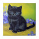 Azulejo com um gato preto no estilo de Vincent van Gogh! Este querido de olhos azuis fica adoravelmente com flores roxas contra uma parede verde e mesa amarela. Um presente maravilhoso para amantes de gatos e colecionadores de arte holandeses!